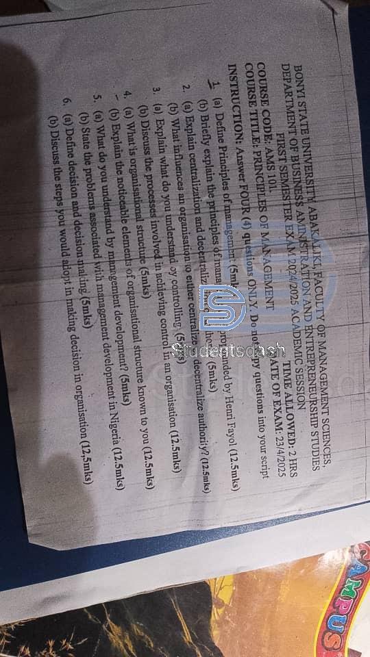 AMS 101 Past Questions and Answers (Principles of Management) 2025