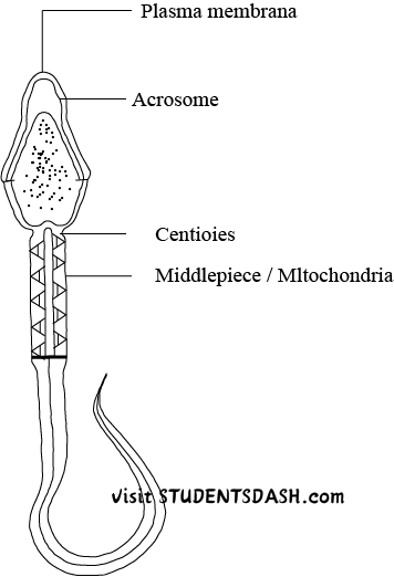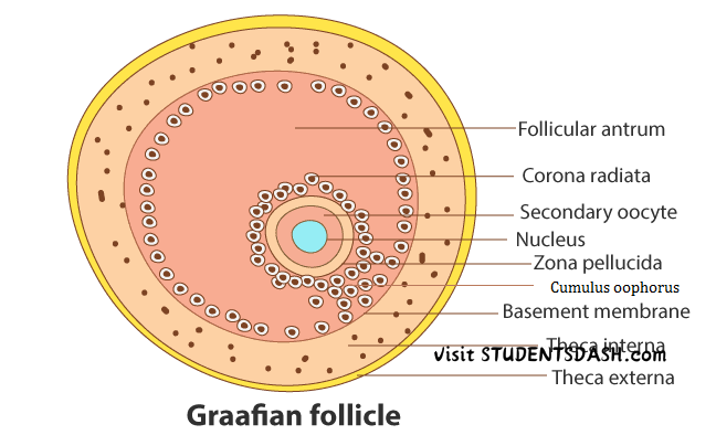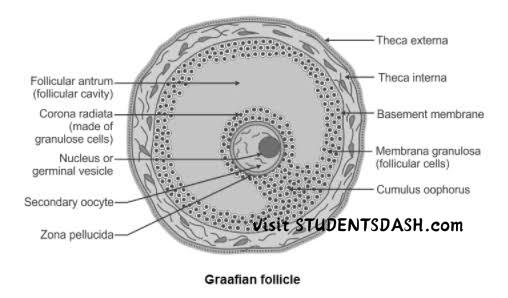 A well labelled structure of the Graafian follicle and a well labelled structure of a matured spermatozoon.