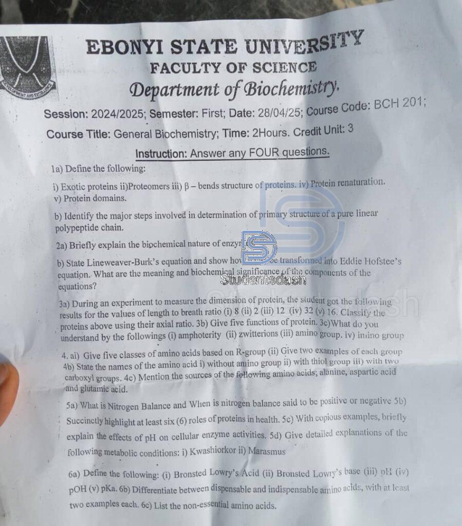 BCH 201 Past Questions and Answers 2025
