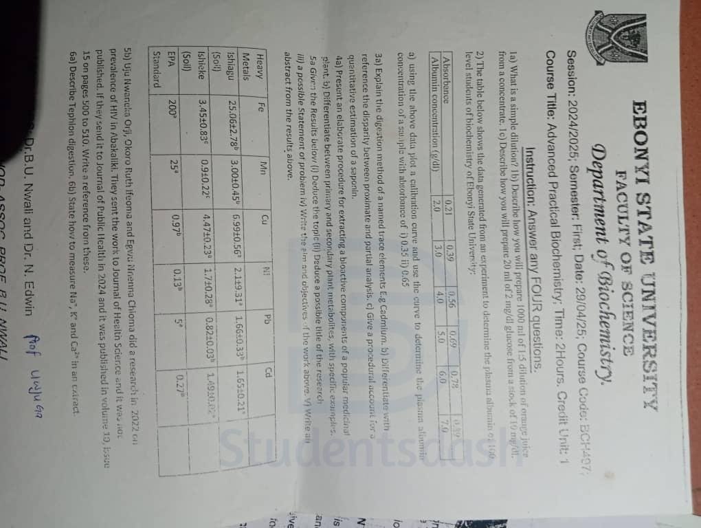 Advanced Practical Biochemistry BCH 407 Past Questions and Answers