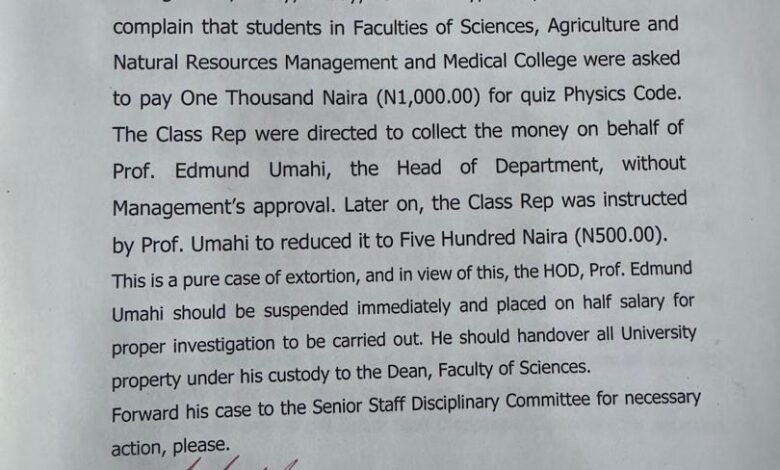 Ebonyi State University, Abakaliki (EBSU), has suspended the Head of the Department of Industrial Physics, Prof. Edmund Umahi, following allegations…