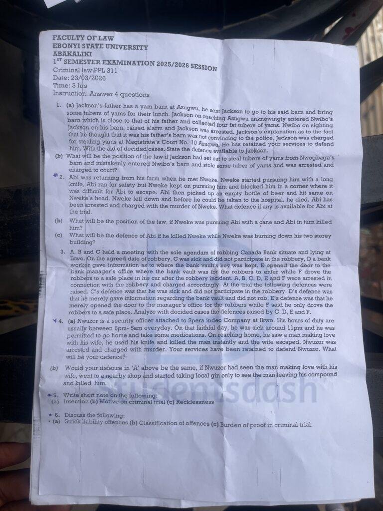 Home/EBSU Past Questions/Criminal Law PPL 311 Past Question and Answers EBSU Past Questions Criminal Law PPL 311 Past Question and Answers studentsdash3 hours ago0 Less than a minute Facebook X WhatsApp Telegram Join @Studentsdash on TG Copy URL URL Copied studentsdash3 hours ago0 Less than a minute Facebook X WhatsApp Telegram Share Facebook X WhatsApp Telegram Share via Email Print