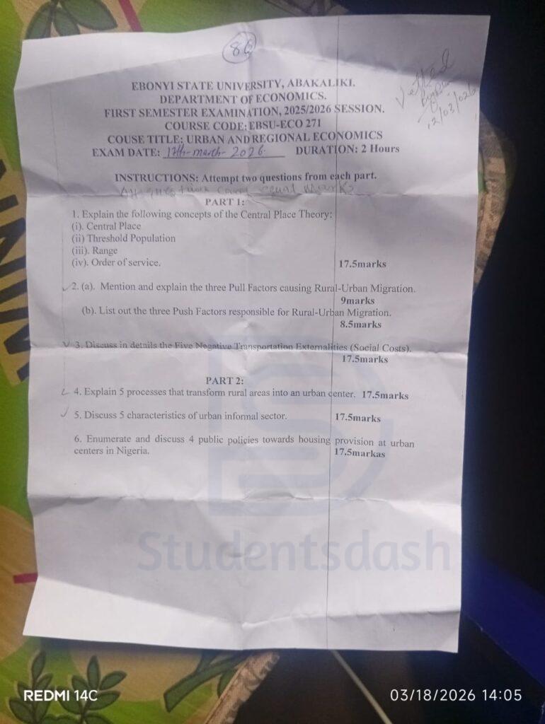 EBSU-ECO 271 – Urban and Regional Economics Past Questions and Answers