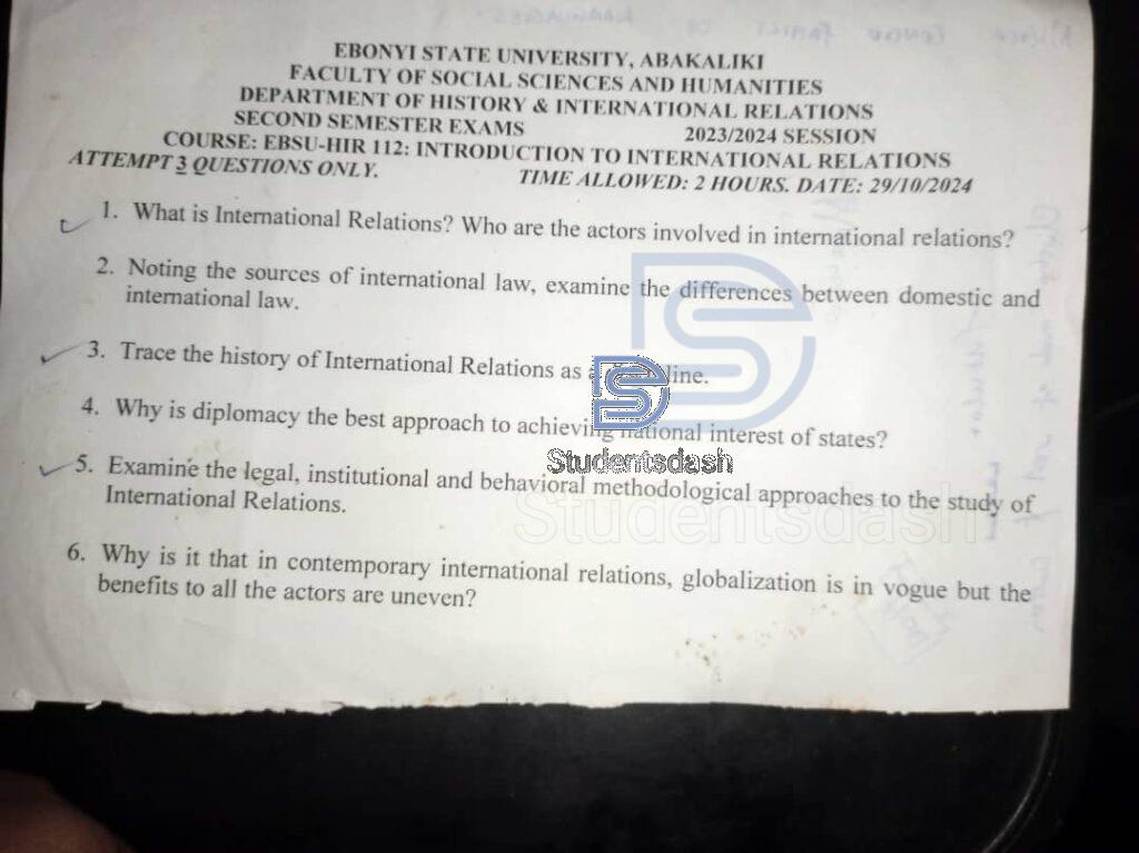 EBSU-HIR 112 past Questions and Answers (Introduction to International Relations)