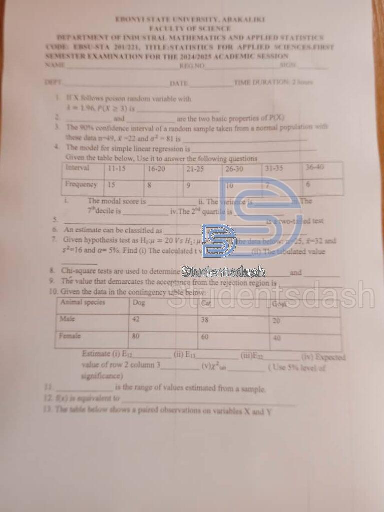 EBSU- STA 201 / STA 221 Past Questions and Answers