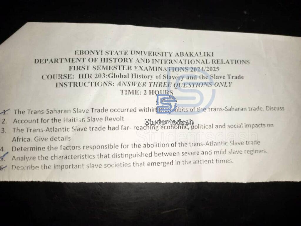 HIR 203 Past Questions and Answers (Global History of Slavery and the Slave Trade)