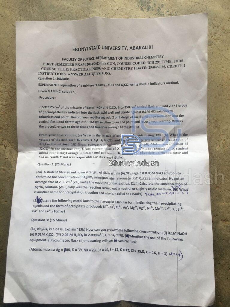 ICH 291 Past Questions and Answers