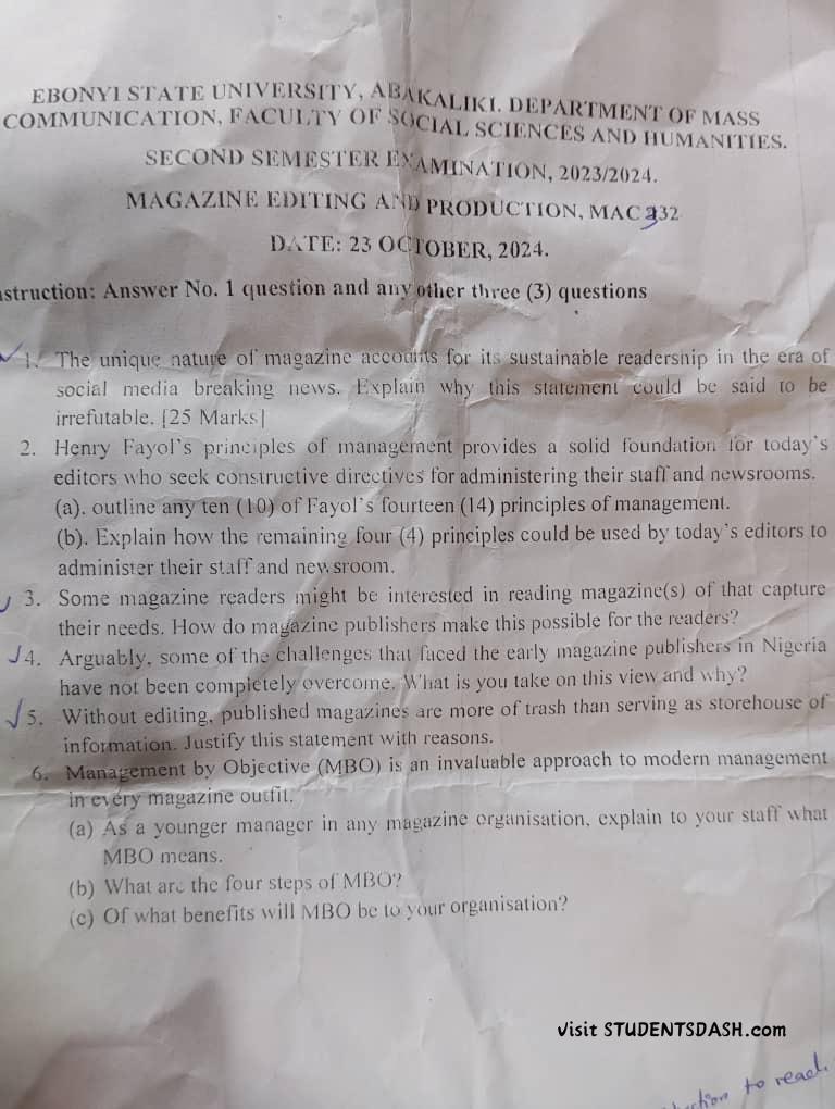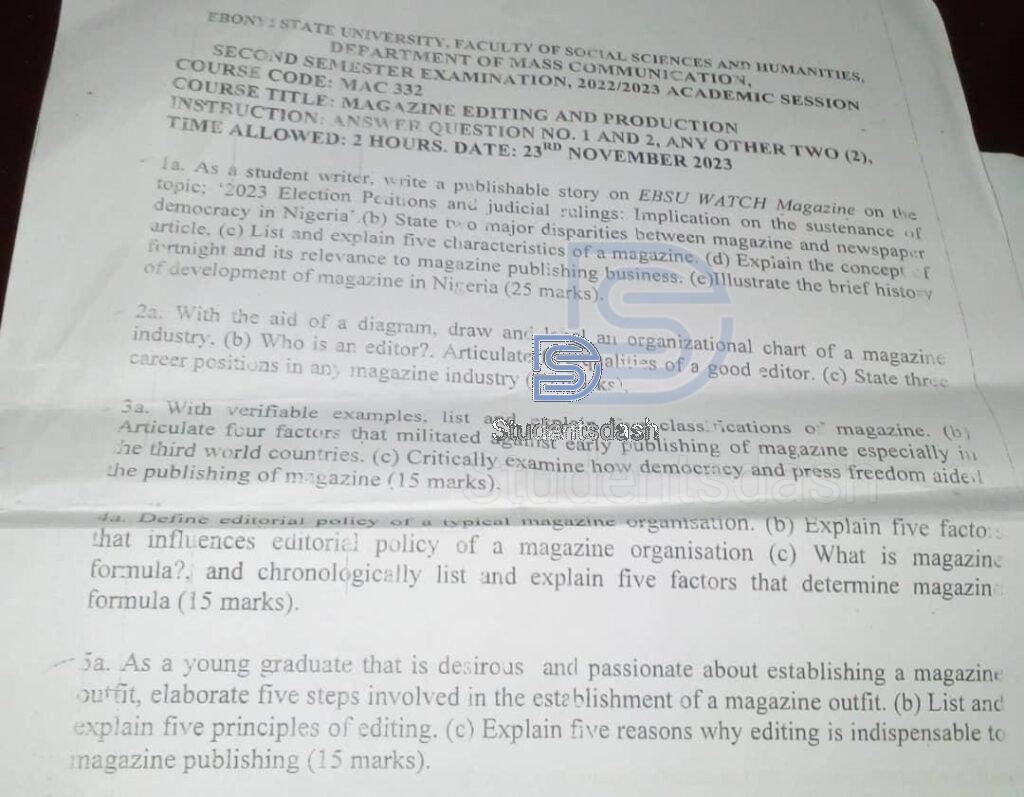 1a. As a student writer, write a publishable story on EBSU WATCH Magazine on the topic; “2023 Election Petitions and judicial rulings: Implication on the sustenance of democracy in Nigeria.”