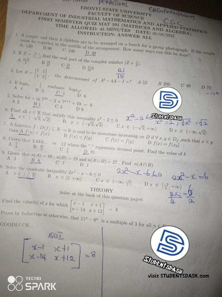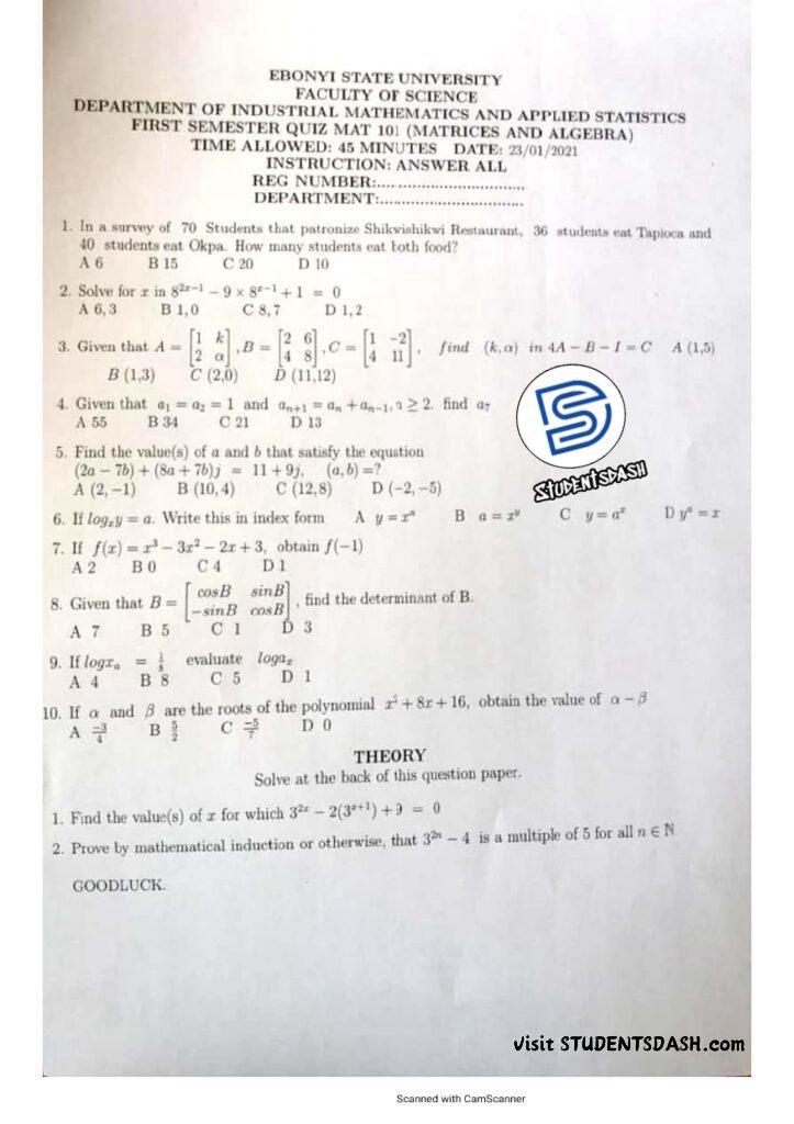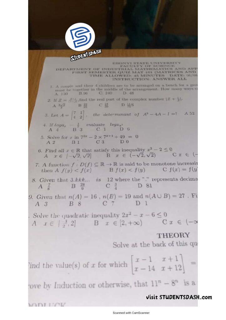 MAT 101 (MTH 101) Quiz Past Questions and Answers