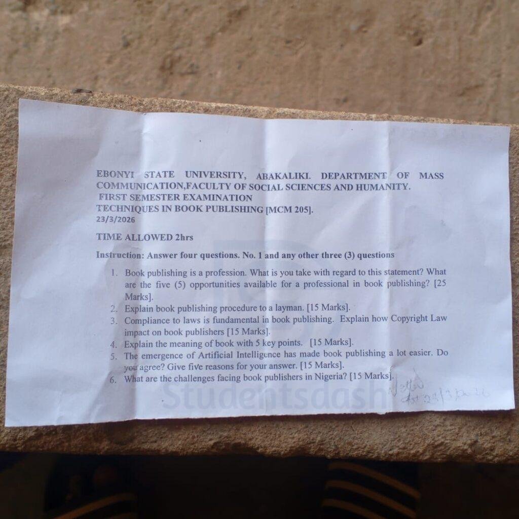 Home/EBSU Past Questions/MCM 205 Past Question and Answers EBSU Past Questions MCM 205 Past Question and Answers studentsdash2 hours ago0 Less than a minute Facebook X WhatsApp Telegram Join @Studentsdash on TG Techniques in Book Publishing Copy URL URL Copied studentsdash2 hours ago0 Less than a minute Facebook X WhatsApp Telegram Share Facebook X WhatsApp Telegram Share via Email Print