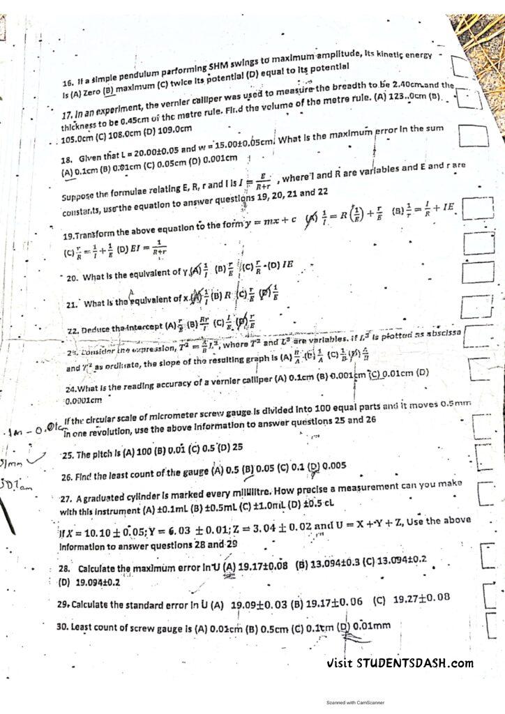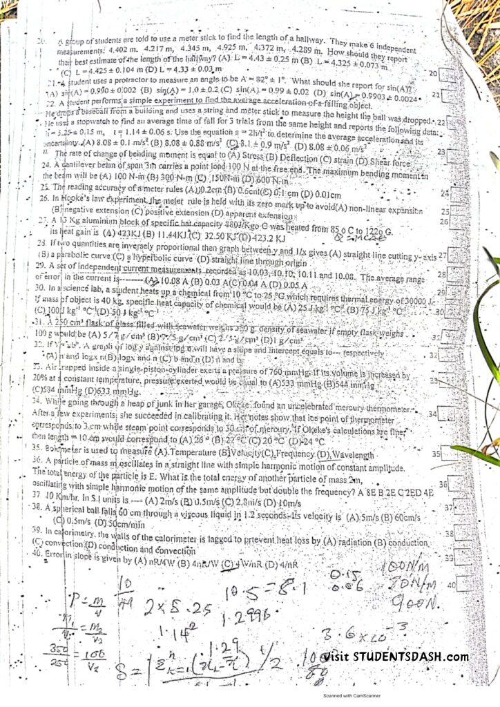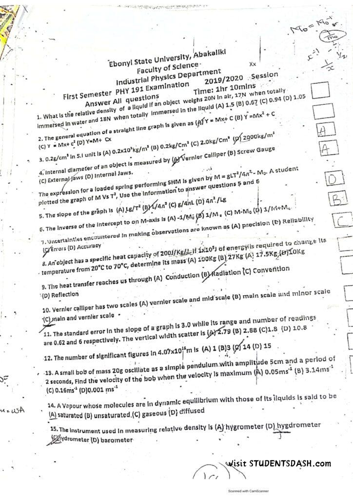 Phy 107 ( PHY 191) Past Questions and Answers