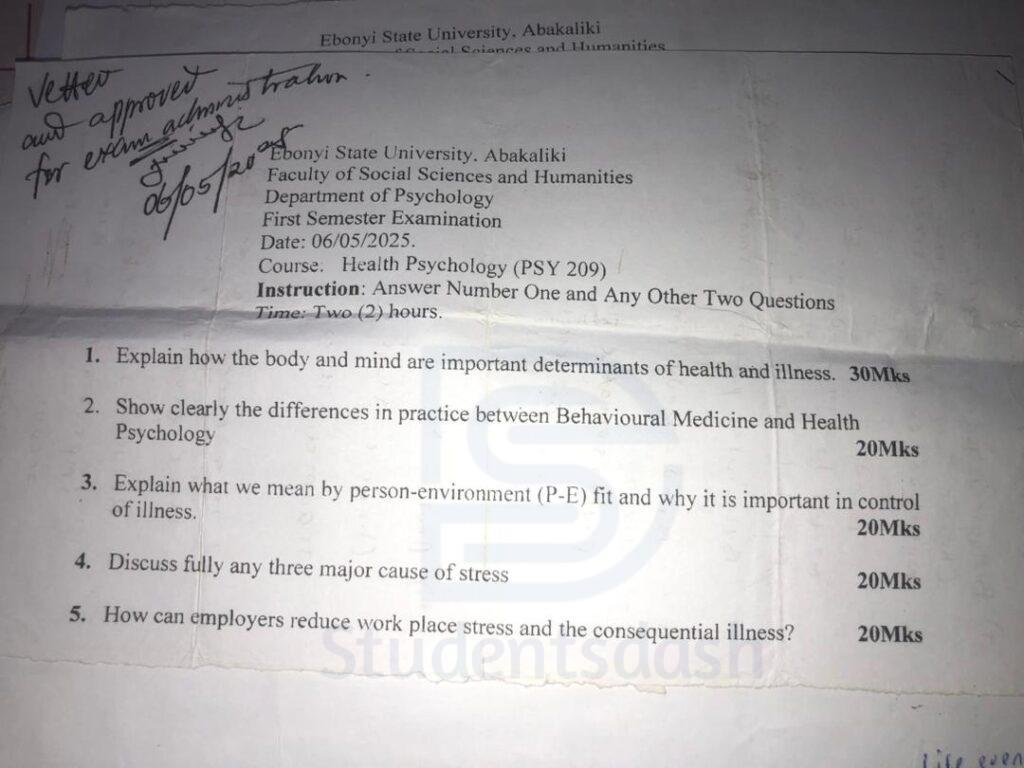 PSY 209 HEALTH PSYCHOLOGY Past Questions and Answers