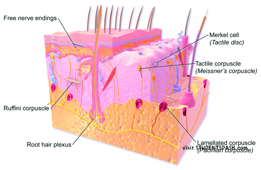 - Detects Touch and Pressure – Specialized nerve endings sense physical contact and pressure.