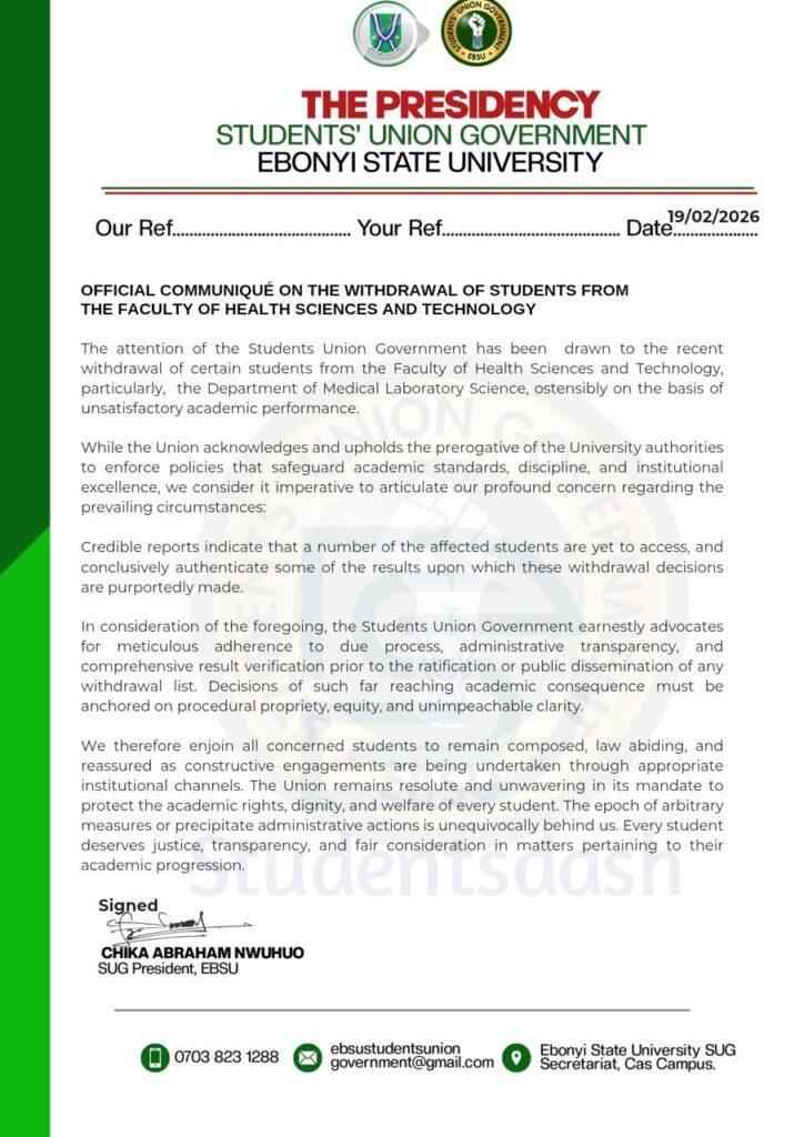 The President of the Students Union Government, EBSU, Chika Abraham Nwuhuo, has officially addressed the recent withdrawal of some students from the Faculty of Health Sciences and Technology, especially those in the Department of Medical Laboratory Science.