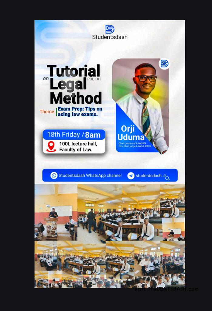 A few days ago, on Friday the 18th at 8 am, we kicked off our Tutorial on Legal Method (PUL 101) in the 100L lecture hall, Faculty of Law. The session was hosted by Orji Uduma, Chief Justice of LAWSA (and former Chief Judge of LAWSA, EBSU), and powered by Studentsdash.